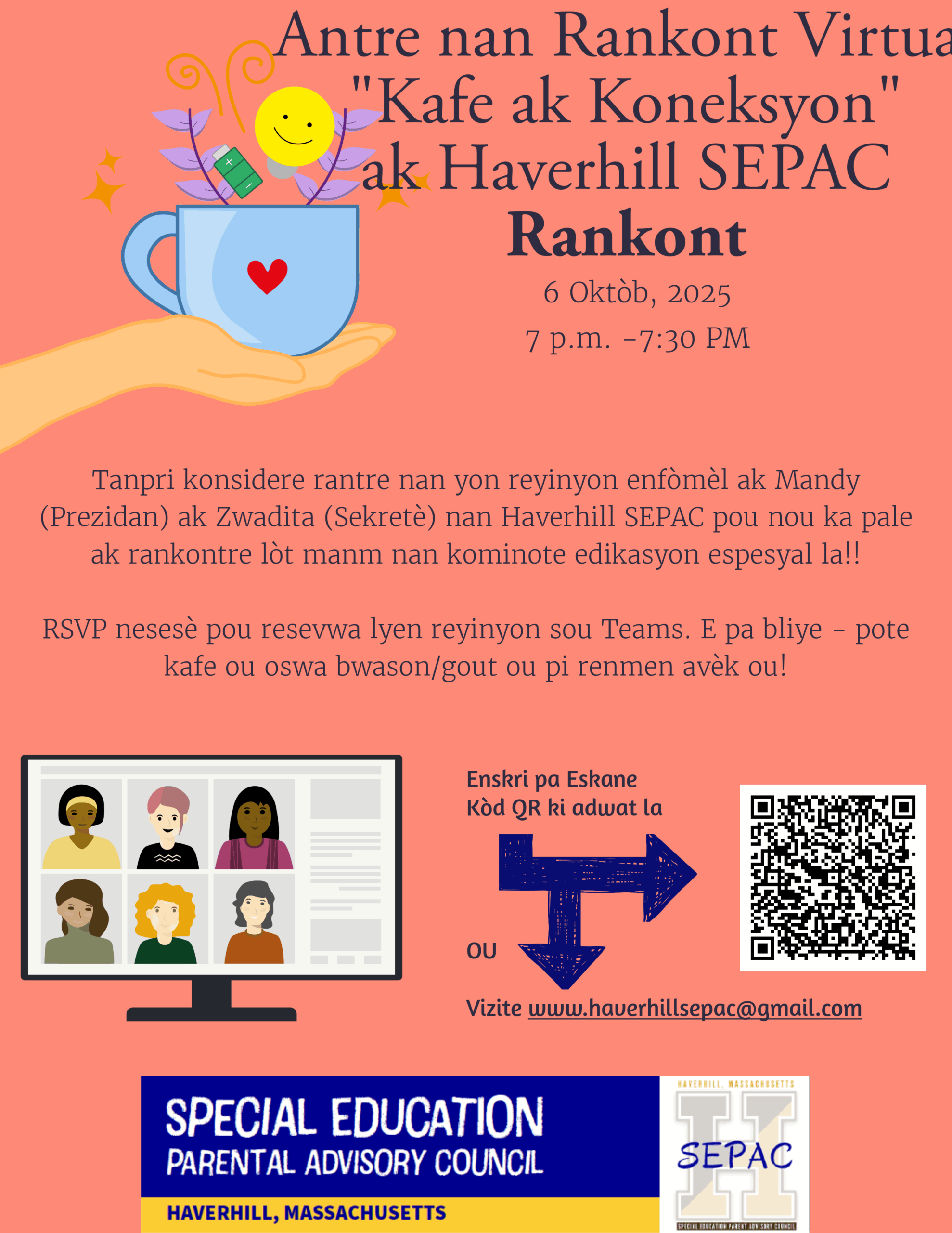 Haverhill SEPAC virtual “Coffee & Connect” Meeting – October 6, 2025 Posted on September 8, 2025 Join Haverhill SEPAC for a virtual “Coffee & Connect” Meeting Monday, October 6, 2025, from 7:00 PM – 7:30 PM RSVP Required for meeting link